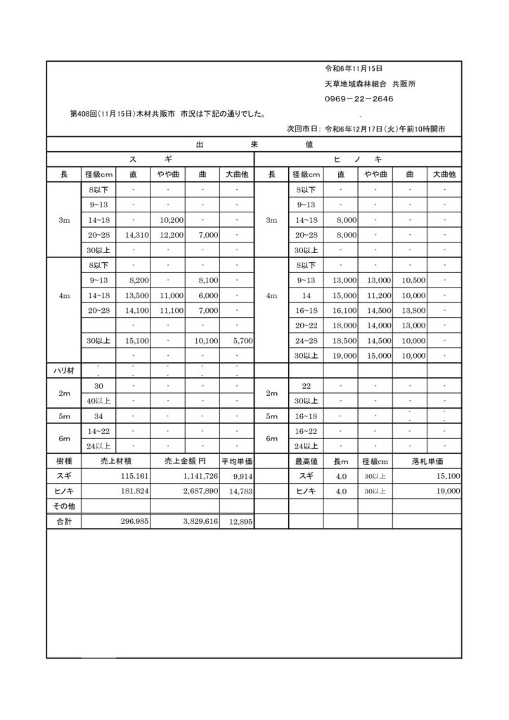 第408回共販市を開催しました。 2024年11月15日 最終更新日時 : 2026年1月5日 Amakusa-forest 令和6年11月15日(金)に≪第408回共販市≫を開催しました。 2024年(令和6年)共販市予定表
