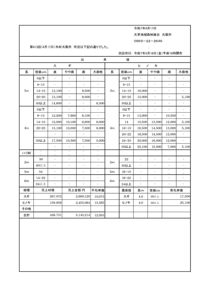 第413回共販市を開催しました。 2025年4月17日 最終更新日時 : 2026年1月5日 Amakusa-forest 令和7年4月17日(木)に≪第413回共販市≫を開催しました。 2025年(令和7年)共販市予定表