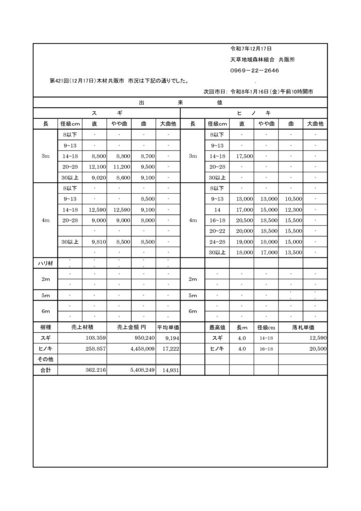 第421回共販市を開催しました。 2025年12月17日 最終更新日時 : 2026年1月5日 Amakusa-forest 令和7年12月17日(水)に今年の納市≪第421回共販市≫を開催しました。 2026年(令和8年)共販市予定表